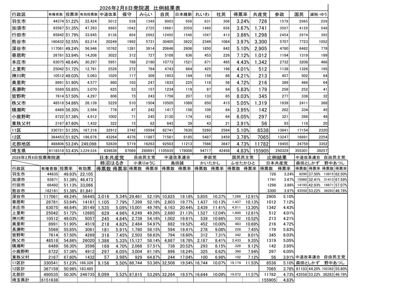 総選挙の埼玉11区 12区 北部地区の各自治比例得票結果