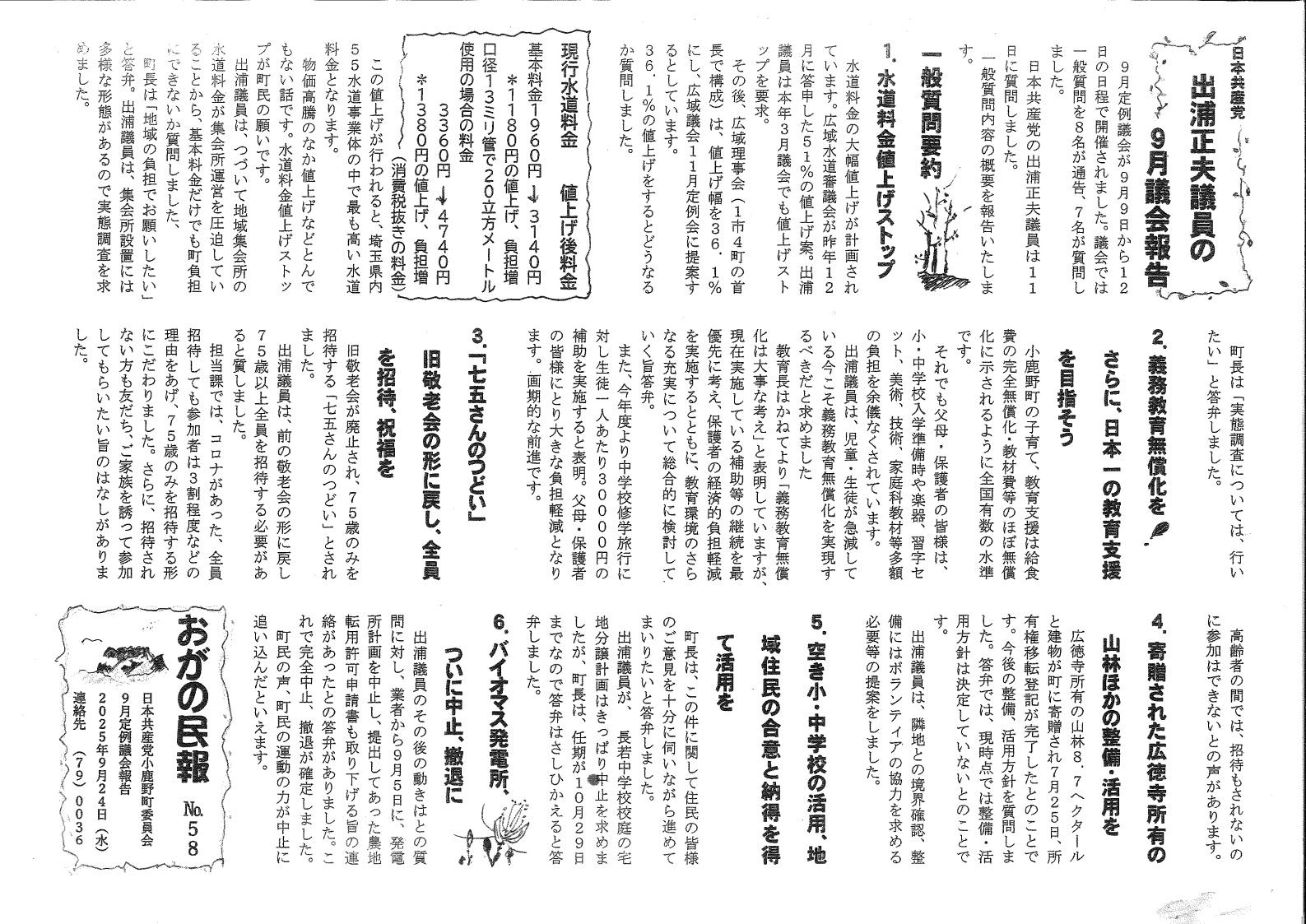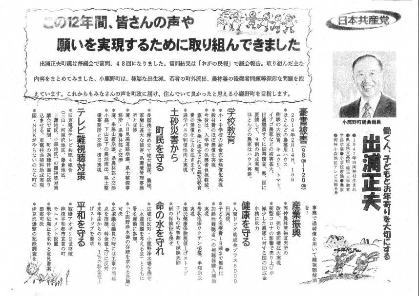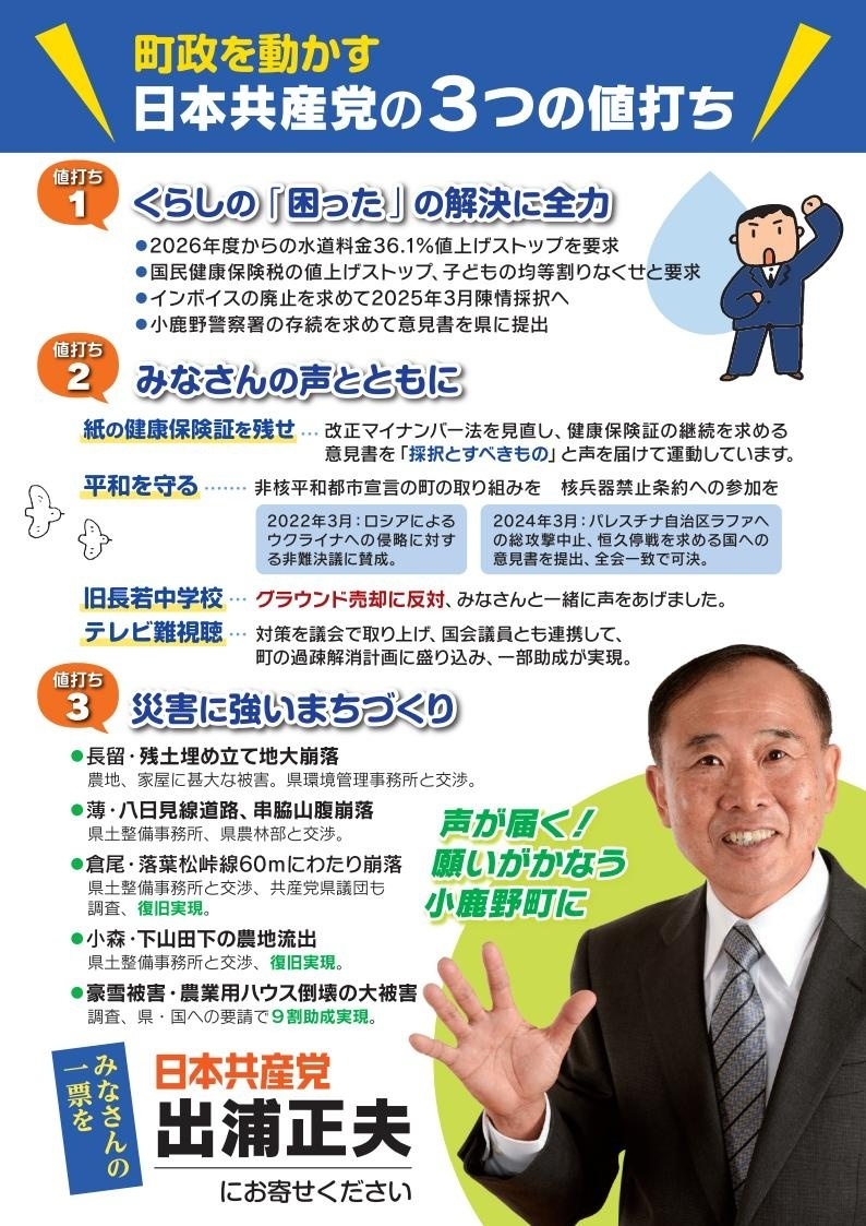 声を届ける。そして、実現する。地方議員の役割、教材費のほぼ無料化も、帯状疱疹ワクチンの助成も、給食費の無償化も、農業用ハウスの大雪再建費用も、みなさんの声を届けてきたからです。今、教育費を無料にと求めています。小鹿野町は日本有数の子育て支援のある町です。入学時の制服などの負担の他、さらに教材費が無料にと求めています。町立病院を守り抜く、水道料金の値上げストップを、自然の摂理に反する長尾根配水をやめて、小鹿野浄水場の存続を、公共交通の充実、みなさんの声を形にして、ずっと住み続けたい小鹿野町に、よそから見ても住みたい町に、声を町に届ける。みなさんの大きなご支援で、お力をお貸しいただきますようにお願いを申し上げます。