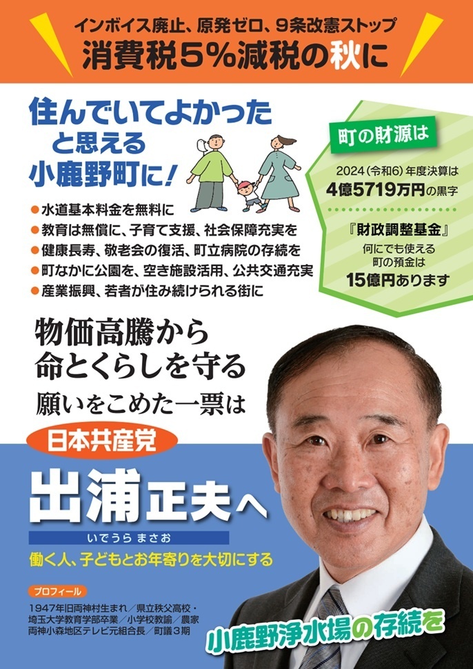 2025年10月12日投票 小鹿野町議選 出浦正夫が7日立候補