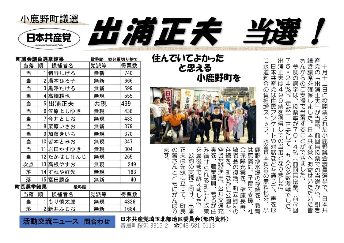 2025年10月12日投票 小鹿野町議選 出浦正夫が5位当選