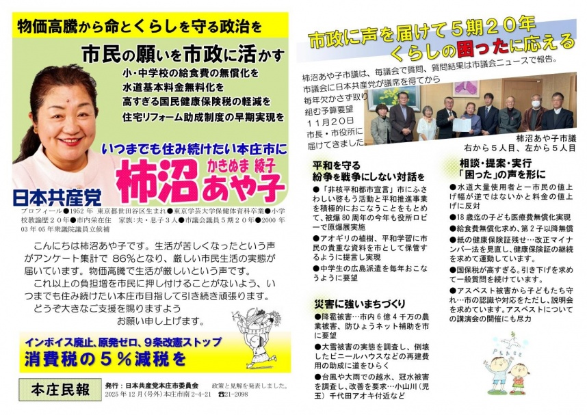 「駅北開発で立ち退きになるかもしれない」「ホテルができるそうだが、ラブホテルでは小学校の通学路なので困る」「自衛隊に名簿の提供しないでほしい」「会社を首になり、これからの生活どうしていったらいいか困っている」「病気で働けない従業員がいるがどうしたらよいか」などたくさんの声を聞いてきました。もっともよく聞くのが、物価高騰で生活が厳しいという声です。「負担増に反対」「補助を増やせないか」役所に要望し、声を形に、みなさんの願いが実現できるようにがんばってきました。