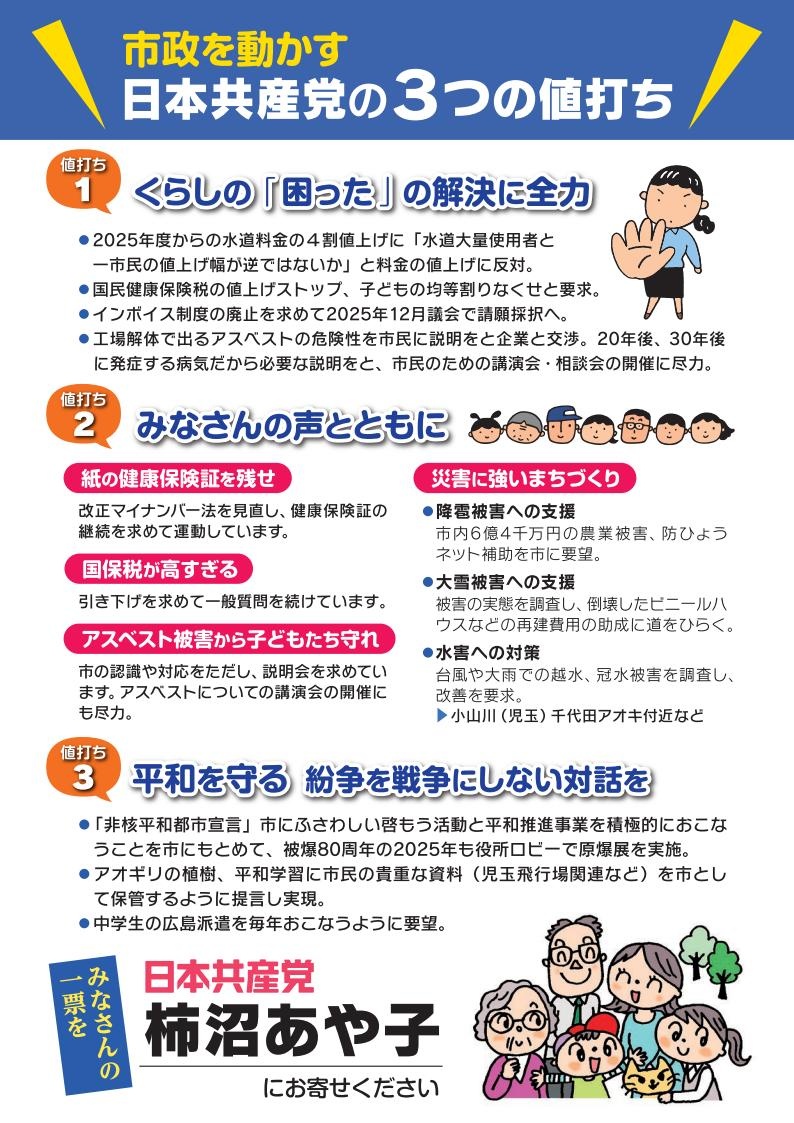22人で1人はみだす若い新人が8人もいる少数激戦の選挙戦、実績とともに、なくてはならない柿沼あや子候補の当選のために、3人、5人、10人と広げてくださいのお願いを広げてください。告示ビラの配布、駅の宣伝、街頭場所へぜひ、お出かけいただき協力を願いします。明日から期日前投票ができます。柿沼あや子への当選のために、お力をお貸しください。
