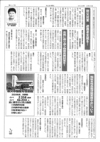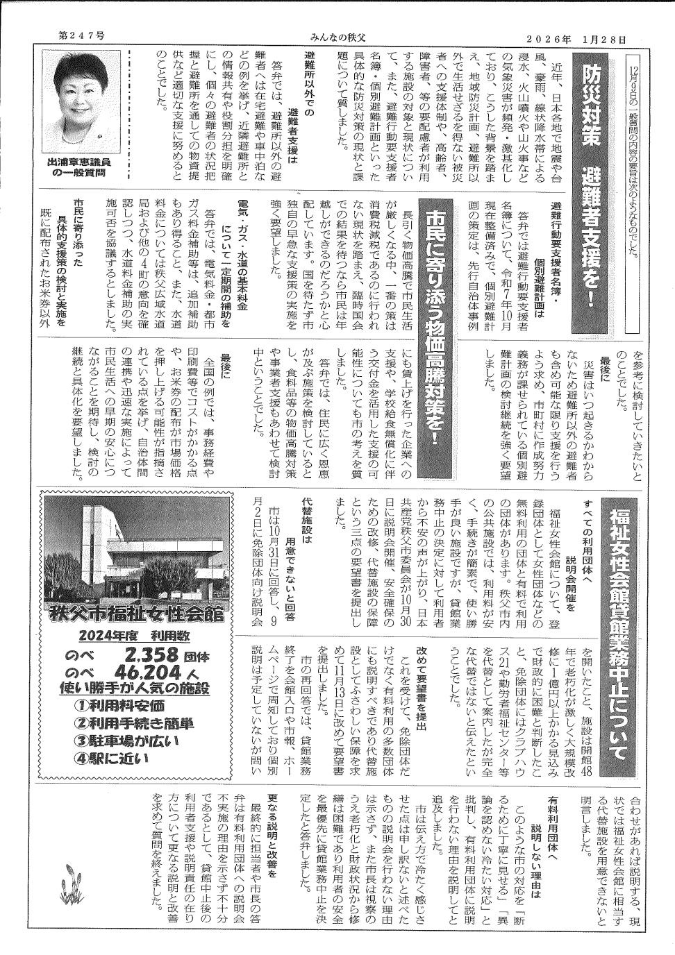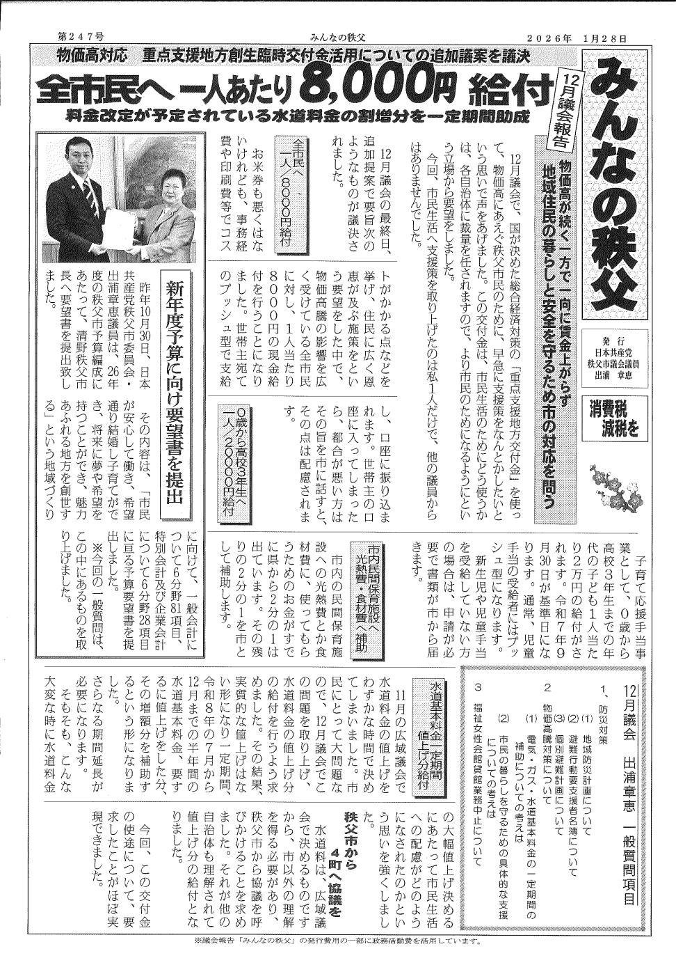 2025年12月秩父市議会報告 日本共産党秩父市議団が発行する「みんなの秩父」12月定例議会報告では、物価高対応 重点支援地方創生臨時交付金の活用についての追加議案「全市民へ一人あたり8000円給付」「料金改定が予定されている水道料金の割り増し分を一定期間助成」の特集他、信念ど予算に向け要望書を提出。出浦あきえ議員は一般質問で「防災対策 避難者支援を」「市民に寄り添う物価高対策を!」「福祉女性会館業務中止について」を特集しています。ぜひご覧ください。 秩父市議会報告(1面、2面)
