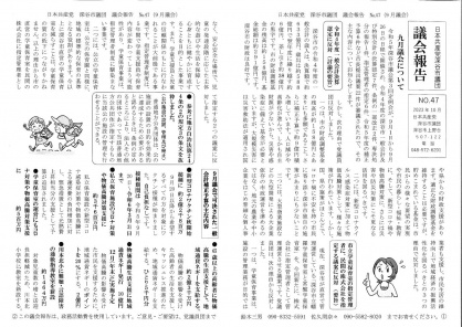 日本共産党深谷市議団が発行する「議会報告」では、9月議会報告をおこなっています。今議会で、鈴木三男議員は「現行の健康保険証の発行継続の決断を」「岡部駅北口に市有地を確保し放置自転車の解決を」「ストマ装具給付基準額の引き上げを」などを、佐久間奈々議員は「有機農業や、農水省が推奨するオーガニックビレッジ宣言について」「学校給食食材の地産地消及び有機化について」などを一般質問で取り上げています。また、私立学童保育質の指定管理者に民間の株式会社を指定する議案への対応などについての質問もぜひご覧ください。