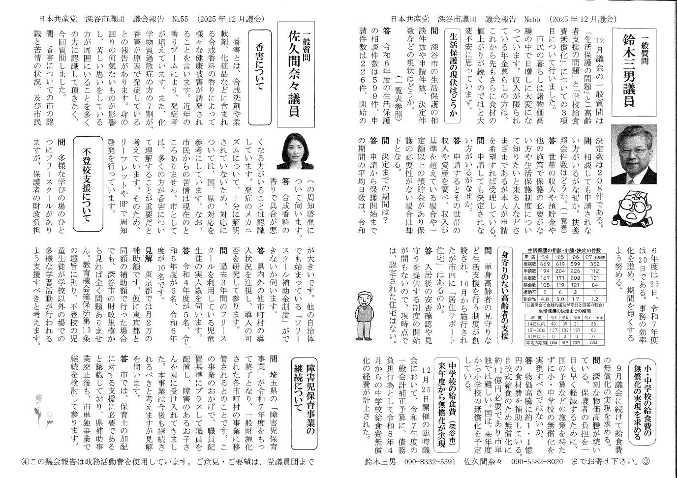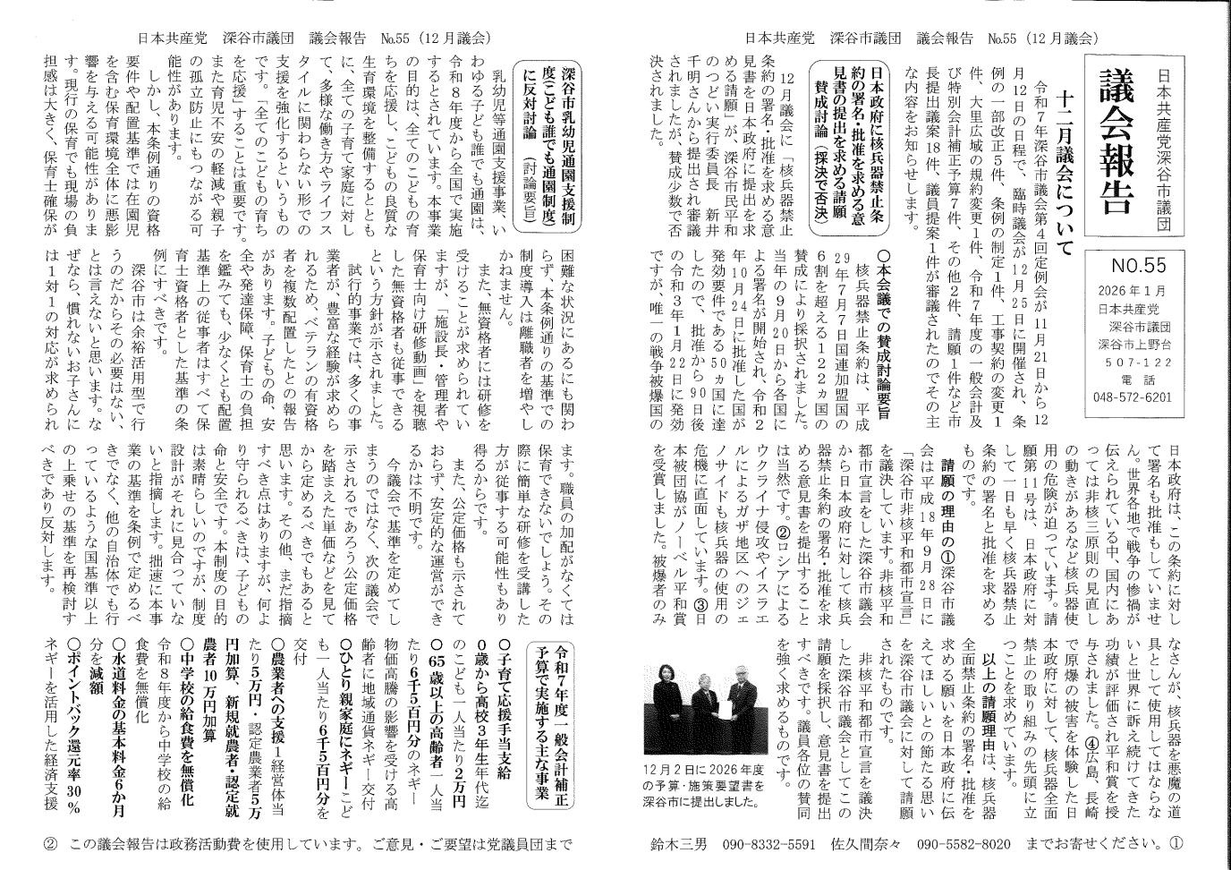 日本共産党深谷市議団が発行する「議会報告」では、「日本政府に核兵器禁止条約の署名・批准を求める意見書の提出を求める請願」「深谷市乳幼児通園支援制度(こども誰でも通園制度)」など特集。一般質問で、鈴木三男議員は「生活保護の現状はどうか」「身寄りのない高齢者支援」「小中学校の給食費の無償化の実現を求める」などをとりあげ、中学校の給食費来年度から無償化が実現を特集。佐久間奈々議員は「香害について」「不登校支援について」「障害児保育事業の継続について」などを一般質問で取り上げています。ぜひご覧ください。