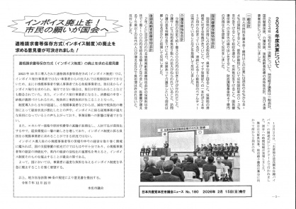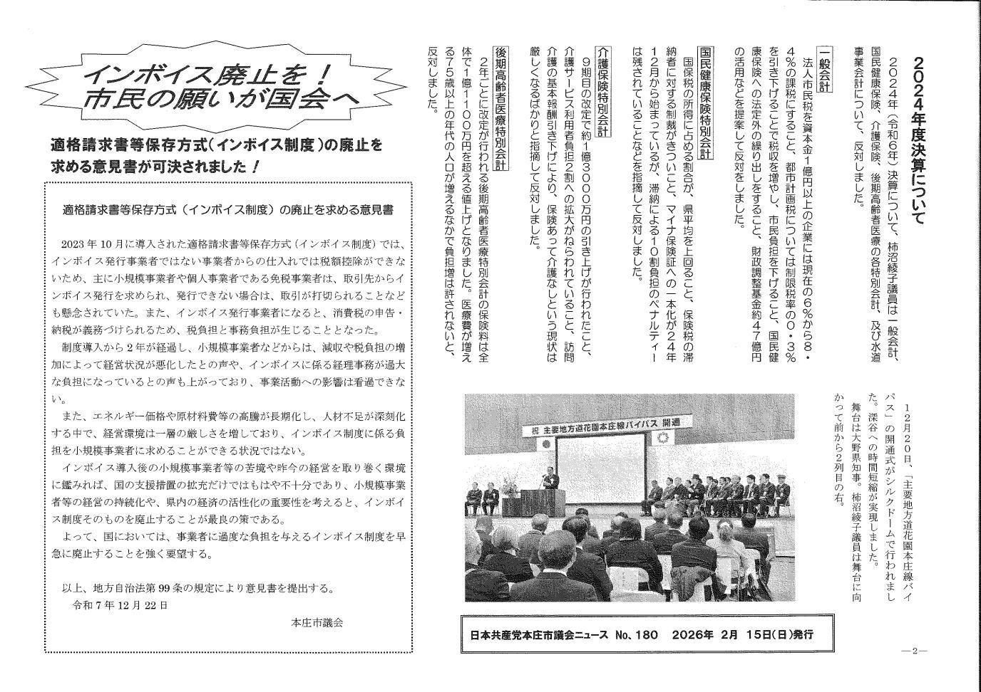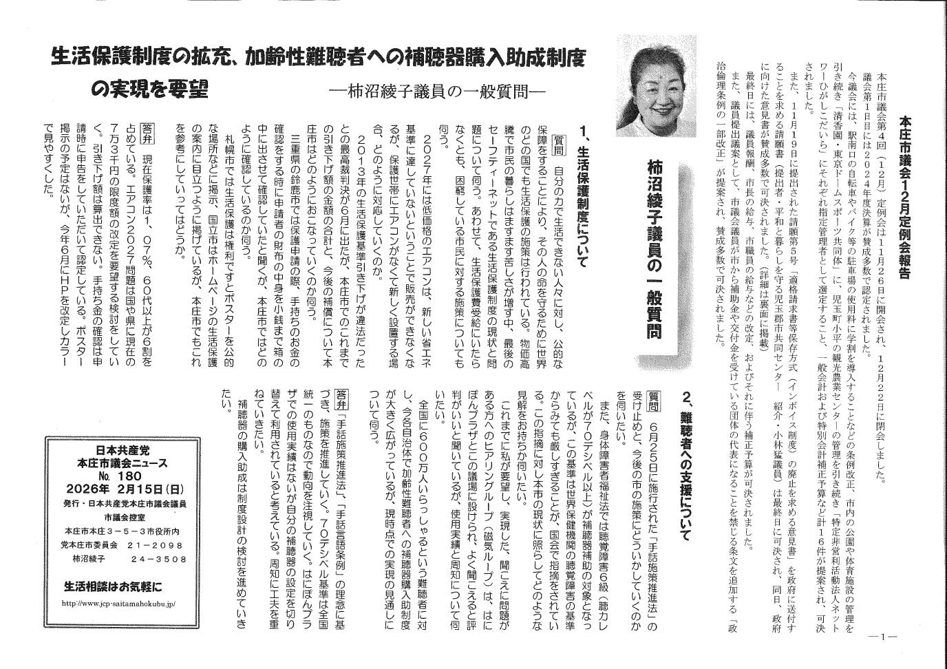 2025年12月本庄市議会報告 柿沼綾子党本庄市議会議員は「日本共産党本庄市議会ニュース」を発行しました。このニュースでは、本庄市議会12月定例会の特集をおこなっています。今議会で柿沼綾子議員は「生活保護制度について」「難聴者への支援について」の一般質問のなどの他、2024年決算特集、インボイス廃止を!市民の願いが国会へ「適格請求書等保存方式(インボイス制度)の廃止を求める意見書が可決されました」を掲載しています。ぜひご覧ください。 本庄市議会報告(1面、2面)