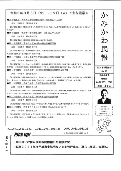 2024年3月神川町議会報告 日本共産党が発行する「かみかわ民報」は、3月議会報告の特集をおこなっています。川浦まさこ議員は、「農業振興について」「防災について」「不登校と人権ついて」を一般質問で取り上げました。ぜひご覧ください。 神川町議会報告(1面、2面)