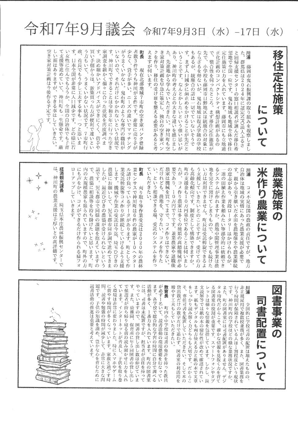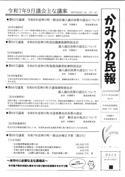2025年9月神川町議会報告 日本共産党が発行する「かみかわ民報」は、9月議会報告の特集をおこなっています。決算議会の特集。川浦まさこ議員は、一般質問で「移住定住施策について」「農業施策の米作り農業について」「図書事業の司書配置について」を一般質問で取り上げました。ぜひご覧ください。 神川町議会報告(1面、2面)