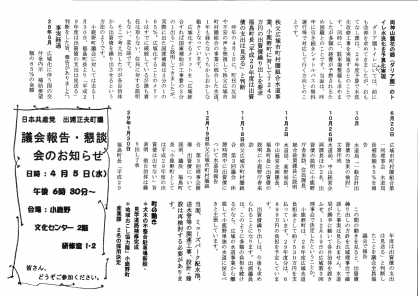 2017年3月小鹿野町議会報告 日本共産党小鹿野町委員会が発行する「おがの民報」は、3月定例議会報告の特集をおこなっています。今号では、出浦正夫議員の一般質問を紹介しています。 小鹿野町議会報告(1面、2面)