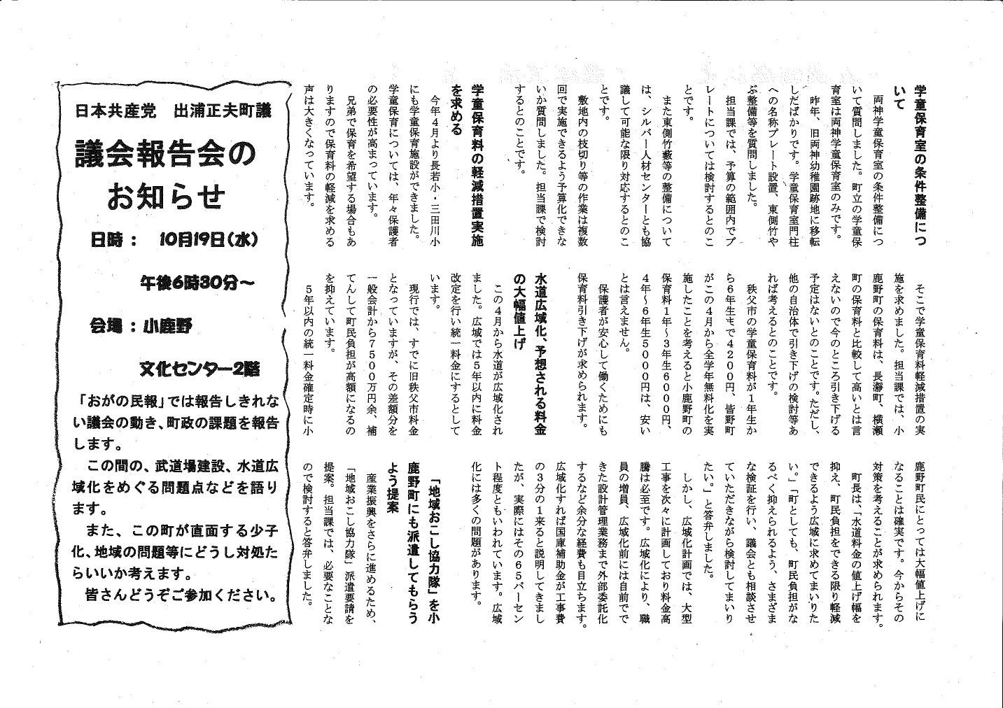 2016年9月小鹿野町議会報告 日本共産党小鹿野町委員会が発行する「おがの民報」は、9月定例議会報告の特集をおこなっています。今号では、出浦正夫議員の一般質問を紹介しています。 小鹿野町議会報告(1面、2面)